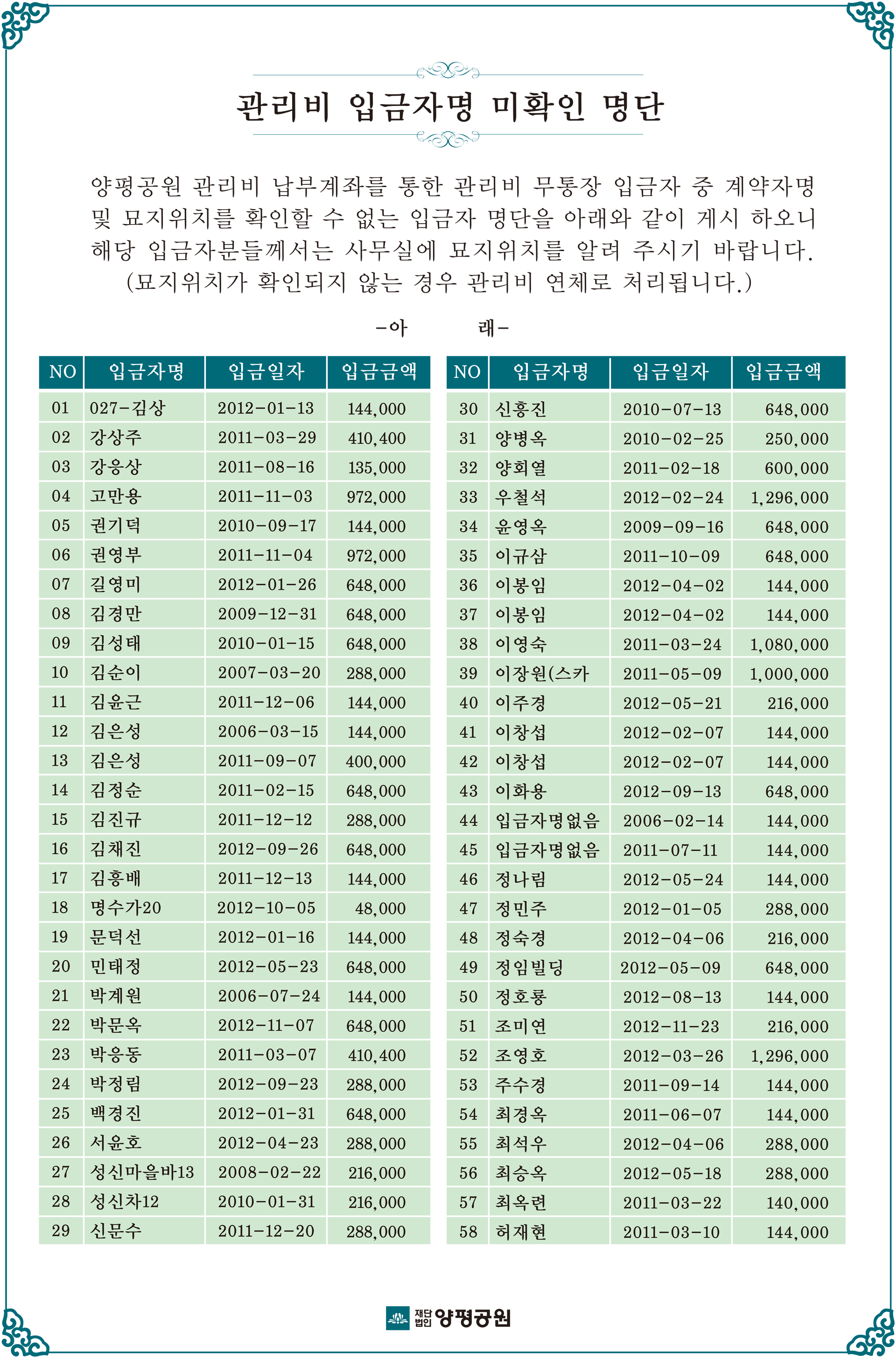 관리비 입금자명 미확인 명단(2013.01.29현재)