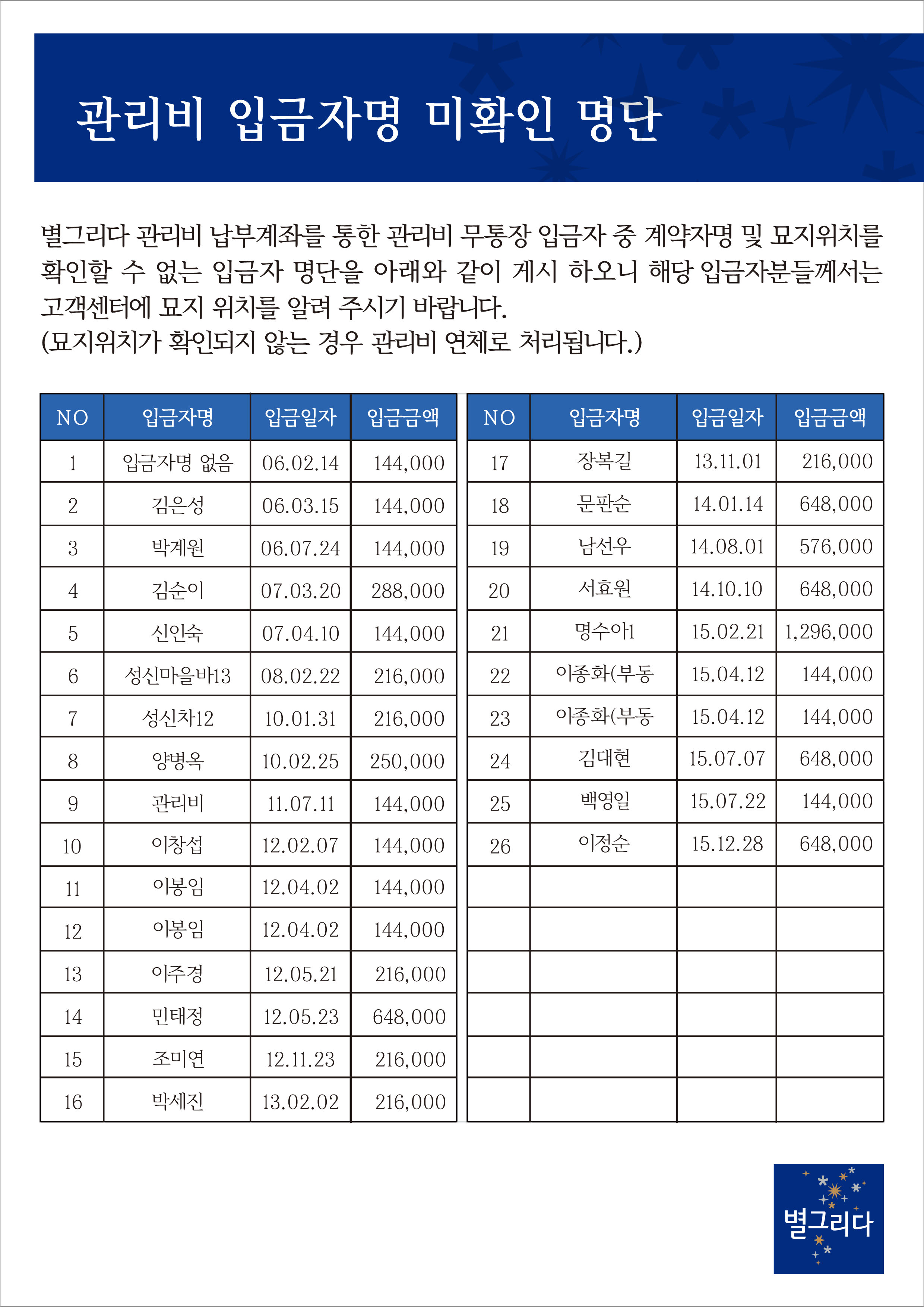관리비 입금자명 미확인 명단(2016.02.12현재)